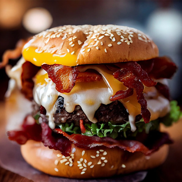 Pan brioche, carne de res, lechuga, tomate milano, cebolla caramelizada, tocineta, queso mozarella, papa francesa y salsa del chef